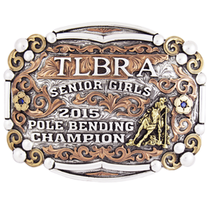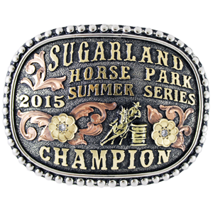 " Here are the buckles being awarded for our Summer Buckle Barrel Racing Series that ends on Thursday, June 18. I think they look awesome! Bullstrong Silversmiths did an amazing job, thank you! "