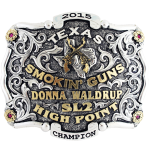 " We received 14 of these Texas Smokin Guns buckles in today. Just in time for the year end awards party! Thanks Bullstrong Silversmiths! Nice job! "